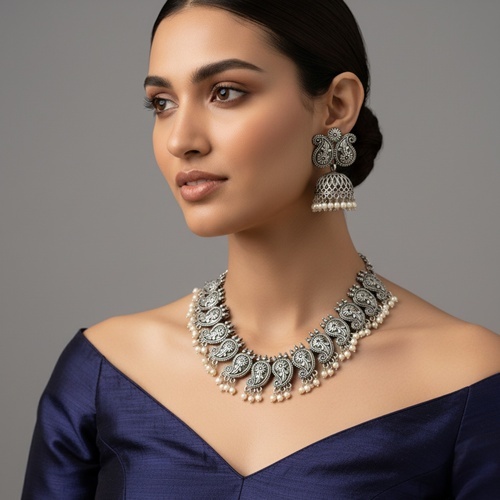 Official site: https://elegantlike.com Product: https://elegantlike.com/product/antique-black-oxidised-flower-petal-necklace-set-with-matching-earrings/ Make a bold and elegant statement with this Antique Black Oxidised Flower Petal Necklace Set. Handcrafted with intricate petal-shaped motifs, the necklace is enhanced with delicate pearl danglers that add a graceful ethnic charm. The set comes with matching oxidised jhumka-style earrings adorned with floral detailing and pearl drops, completing the regal look. Despite its heavy antique design, the jewellery remains lightweight and comfortable, perfect for long festive wear. A versatile piece that pairs beautifully with sarees, lehengas, gowns, and Indo-western outfits, making it a must-have for your jewellery collection. Features Antique black oxidised finish with floral petal motifs Handcrafted detailing with pearl danglers for added elegance Matching statement earrings for a complete festive look Lightweight yet durable & skin-friendly Perfect blend of traditional and modern artistry Perfect For Weddings & Bridal Wear Navratri, Garba & Festive Nights Heritage & Cultural Celebrations Fashion & Ethnic Photoshoots Gifting for Sisters, Friends & Bridesmaids ![]() | |