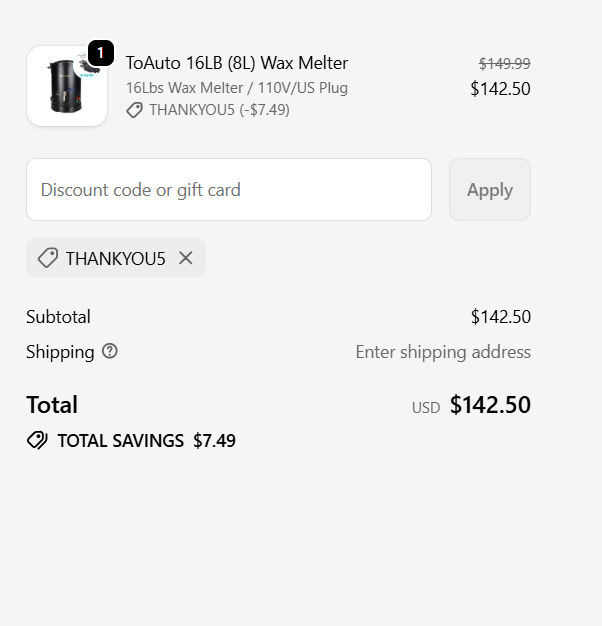 Get an extra 5% off ToAuto wax melters and candle-making kits with code THANKYOU5 at checkout — enjoy tax-free, local shipping, and stackable savings up to 20% off! ![]() | |