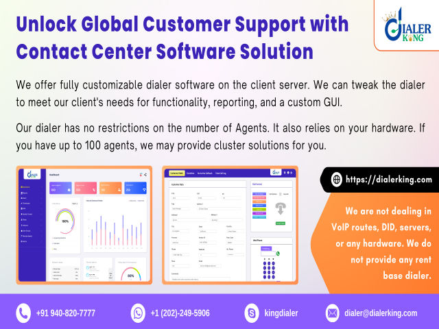 Global support is made possible by DialerKing Technology's Contact Center Software Solution. A contact center software program designed to improve customer service and boost productivity. You can customize our fully customizable dialer software to meet your specific company requirements by running it on your client server. Whether you need functionality, reporting, or a customized graphical user interface (GUI), we have you covered! If you have up to 100 agents, we offer efficient cluster solutions to meet your demand. Discover Live – Watch Our Demo! : https://demo.dialerking.com/call-center-dialer.php Customizable & Scalable: Relying on your hardware, our software is adaptable and scalable, ensuring that it meets the ever-growing needs of your contact center. Reach us at: +91 940 820 7777 WhatsApp: +1(202) 249 5906 Skype ID: kingdialer Email: dialer@dialerking.com Website: https://dialerking.com Why Choose DialerKing? Enjoy seamless integration, expert support, and enhanced productivity—all with a solution built for your success. ![]() | |