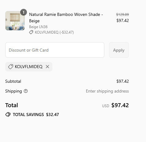 Use promo code KOLVFLMIDEQ to get 25% off your entire order of Bamboo Woven Shades from TwoPages Curtains. Style, quality, and savings—don’t miss this limited-time offer! ![]() | |