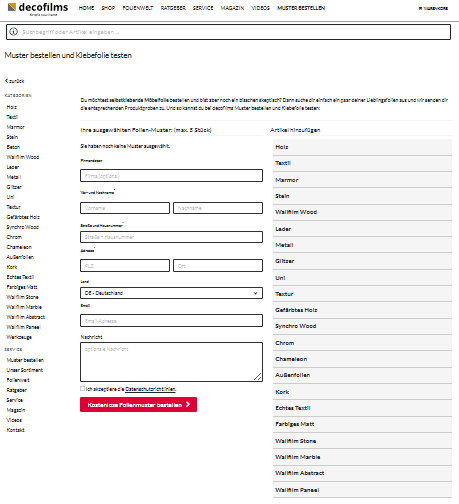 Suche dir einfach 5 deiner Lieblingsfolien aus und wir senden dir die Produktproben zu. So kannst du bei decofilms Muster bestellen und Klebefolie testen. ![]() | |